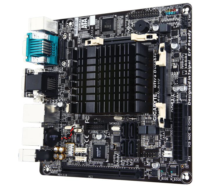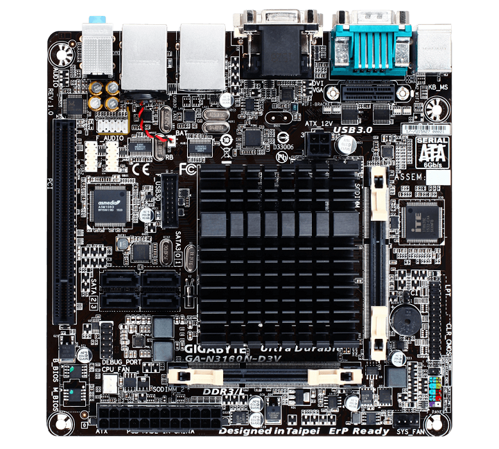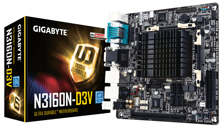 Gigabyte GA-N3160N-D3V. Tipos de memórias suportadas: DDR3, DDR3L, Tipo de memória slots: SO-DIMM, Velocidades de relógio de memória suportados: 1333/1600 MHz. Processador: Intel Quad-Core Celeron N3160 SoC , Processor socket: FCBGA1170. Interfaces suportadas de armazenamento: Sata 6Gb/s. Família de chipset da placa-mãe: Intel.