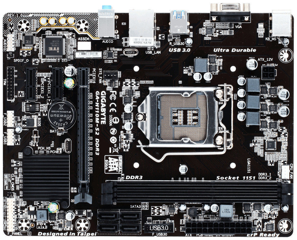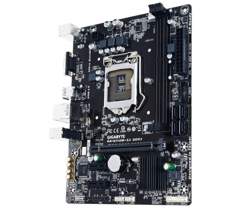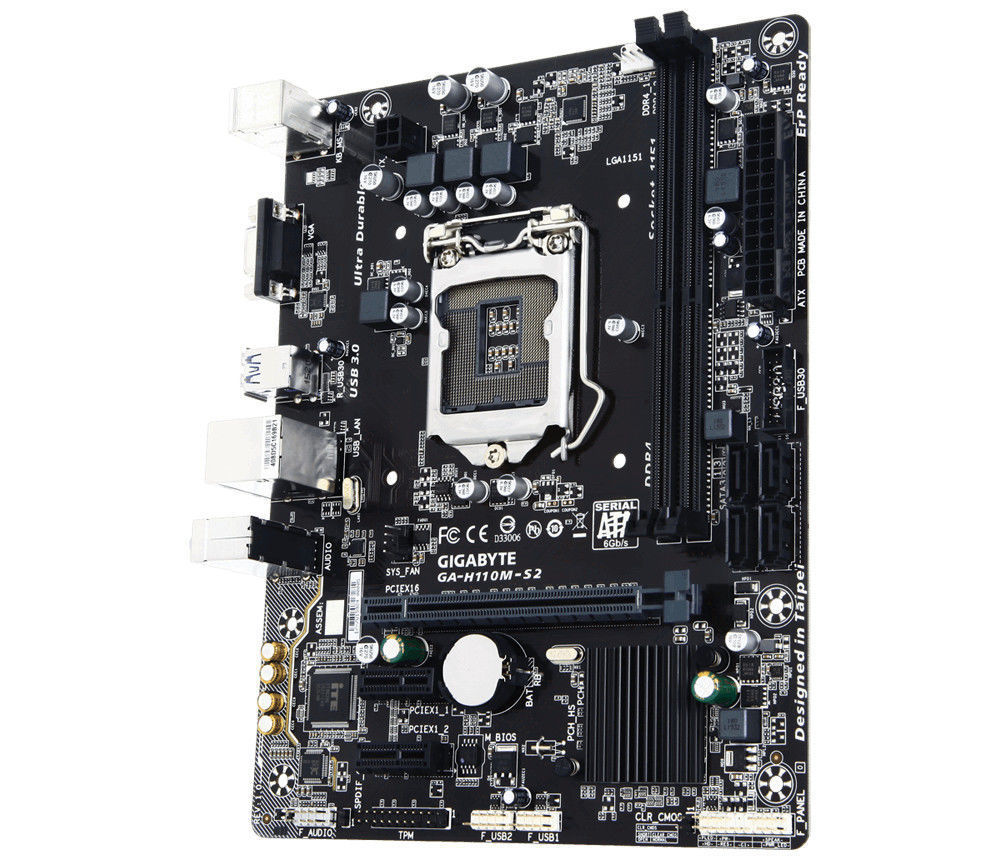 Gigabyte GA-H110M-S2. Tipos de memórias suportadas: DDR4-SDRAM, Tipo de memória slots: DIMM, Canais de memória: Duplo. Família de processador: Intel, Tomada de processador: LGA1151. Interfaces suportadas de armazenamento: Serial ATA III. Tipo de ethernet interface: Gigabit Ethernet