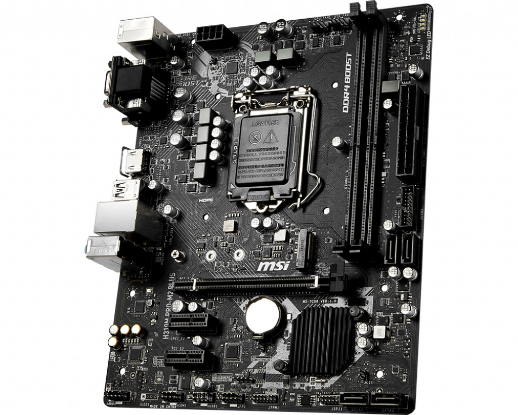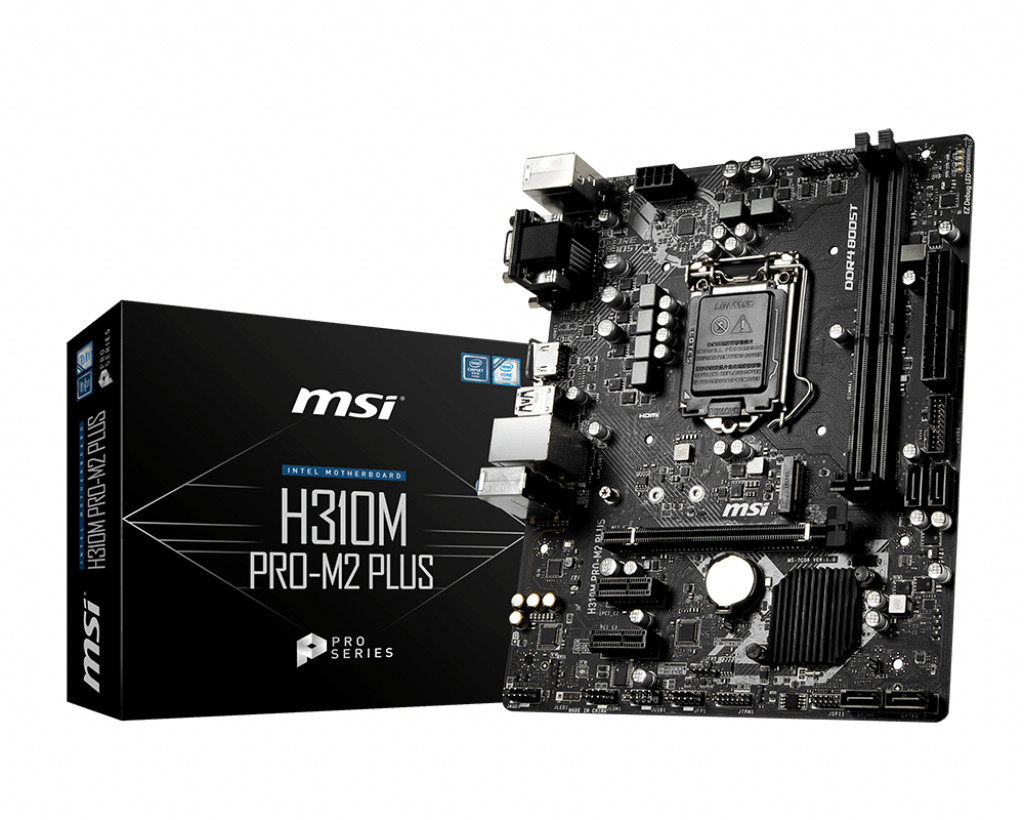 MSI H310M PRO-M2 PLUS. Fabricante do processador: Intel, Tomada de processador: LGA 1151 (Ranhura H4), Processador: Intel Celeron, Intel Core i3, Intel Core i5, Intel Core i7, Intel Core i9, Intel Pentium. Tipos de memórias suportadas: DDR4-SDRAM, Tipo de memória slots: DIMM, Velocidades de clock de memória suportados: 2133,2400,2666 MHz. Resolução Máxima: 4096 x 2160 pixels. Tipo de ethernet interface: Gigabit Ethernet, Controlador LAN: Intel I219-V. Componente para: PC, Estrutura da motherboard: Micro ATX.